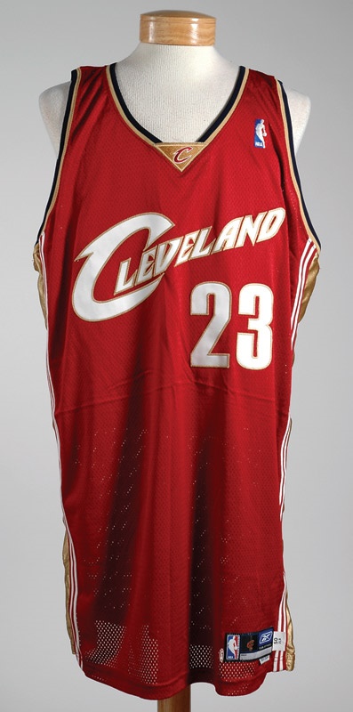 The stakes have been raised now that LeBron's buddy and classmate of '03, Dwanye Wade, has a ring. So expect to see the unexpected (and never before imagined) this upcoming season as James will surely take his game to yet another other-worldly level. Offered is a burgundy "road" jersey he donned during his sensational rookie season. Sewn to the chest in white tackle twill is "Cleveland" over his and his idol's number "23" and on the reverse rests "James 23" in the same style. Nicely finished with gold dazzle side panels with red and white striped knit borders. Finally, the Reebok tagging on the tail is joined by [size] "50 2LB", 2003-2004", and "Play Dry" flag tags. Comes with two LOA's. The premiere rivalry in all of basketball has just begun, so sit back and enjoy the ride!