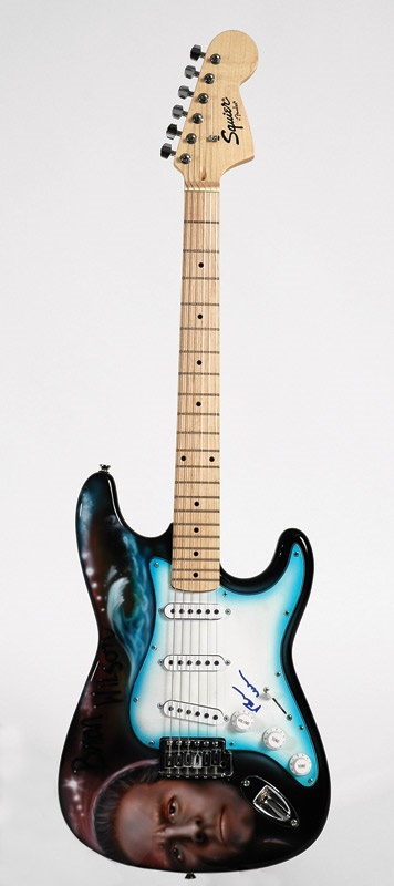 Airbrushed with an image of the ageless Beach Boy, this Fender Squier electric guitar was later signed by Brian Wilson himself. The blue sharpie autograph (9/10), obtained in person on October 2002, rests nicely on the pick guard. EX+-EX-MT.