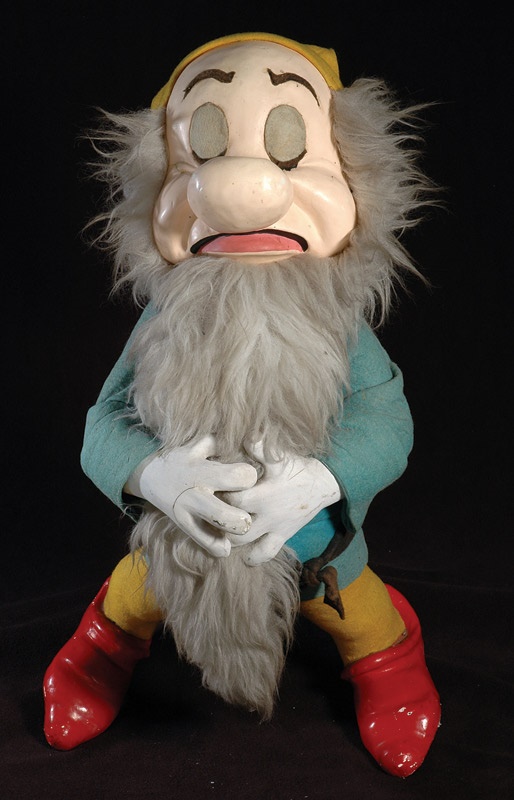 “Sleepy,” protector to Snow White and housemate to six other famously named dwarfs, stands dozing, propped against himself - head tilted back, feet leaning inward, felt eyelids closed, as he did as an original display at the opening of Disney World in Los Angeles in 1971. This marvelous, original gesso figure is in EX condition and has enchanting detail, from the long “real beard” and bulbous nose to the felt hat and clothes. Stands by means of an iron rod projecting from its back. Hi Ho, Hi Ho!