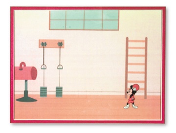 Spirited image of Mickey in basketball uniform holding a basketball. Background of gym is the perfect match. Cel is 9x11" and Mint. Framed to impressive 17x19". Believed to date from the 1980's.