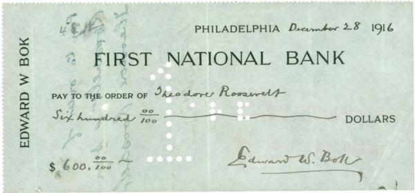 Beautiful signed check is endorsed on the verso in thick black fountain pen “Pay to the Order of Roosevelt & Son...Theodore Roosevelt”. Below someone (his son?) has signed Roosevelt & Son". Dated December 28, 1916 (Christmas bonus!) it is “Pay to the Order” of Theodore Roosevelt and is signed by Edward W. Bok, the publisher of the Ladies Home Journal. This was for an article by TR entitled, “Men". Check has normal cancellations that do not affect signature, o/w VG-EX, signatures except for tiny smudge, are NRMT.