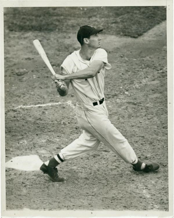 Superb photo of the Splinter snapped just as he knocks another homerun during the 13th Annual All Star Game at Fenway Park. That day on July 9, 1946, Williams paced the American League to a 12-0 victory over the Nats, crushing two longballsin four hits. Associated Press stamping on reverse along with original paper caption and only minor pinholes, overall EX.