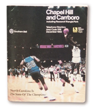 Interesting Jordan piece is one you may not see again. Chapel Hill & Carrboro 1982 Southern Bell phone directory shows Michael Jordan making a shot for North Carolina on the cover. In the bottom corner "North Carolina Is The State Of The Champions." EX.