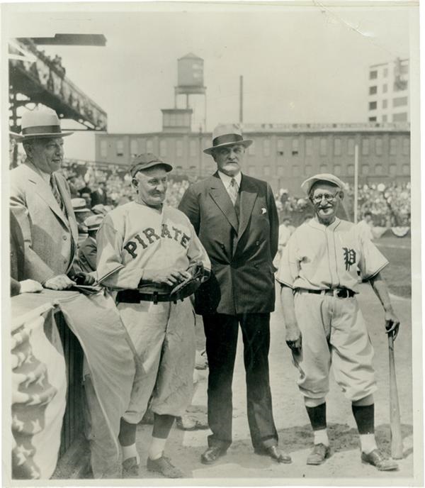 Fantastic photo taken on the day the Phillies celebrated their 50th Anniversary includes Honus Wagner, NL President John Heydler, former NL President John Tenner, and one-time Phils outfielder George Andrews. Crease to the upper right corner, where there is also a tiny area of paper loss. Associated Press stamp on the back along with original paper caption. EX.