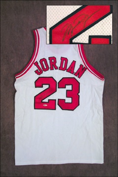 Upper Deck authenticated signature is in perfect black sharpie on a flawless replica of the home gamer that M.J. wore during his Chicago Bulls days. All U.D. paperwork, stickers and packaging included.