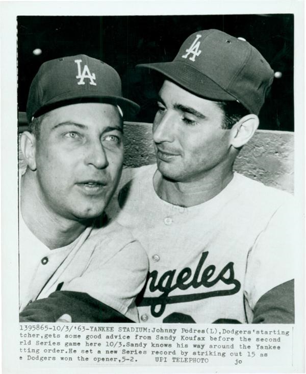 Day after Sandy Koufax struck out 15 Yankees to establish a World Series record. He is giving advice to former Brooklyn teammate, Johnny Podres, who opposes the Bombers in Game 2. UPI stamp on the verso. EX-MT. 8x10”.