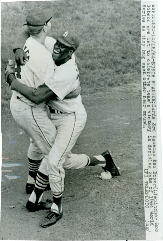 Stunning oversized shot of Gibson being hugged by the glorious Ken Boyer. UPI stamp on the verso. EX-MT. 7.5x13”.