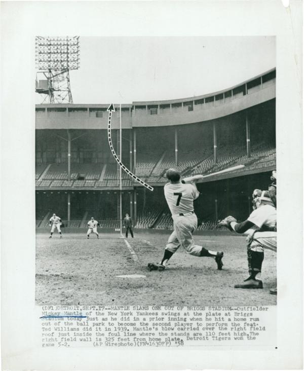 Mantle swings at the plate at Briggs Stadium just as he did the prior inning when he hit a home run completely out of the park. Mick's blow carried over the right field roof, just inside the foul line where the stands are 110 feet high (the right field wall is 325 feet from the plate). Associated Press stamping, front caption, EX-EX+ (but will frame as Mint). 8 x 10".