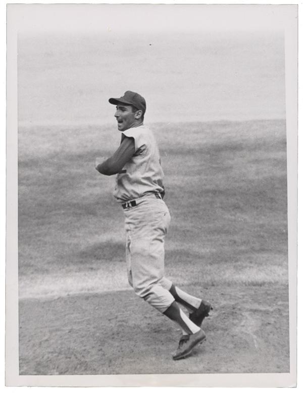 Shown is Koufax firing the final pitch of the 1963 World Series opener (10/3/63) against the Yankees in Yankee Stadium. The ball sped past pinch hitter Harry Bright for Sandy's series record-breaking 15th strikeout. World Wide Photos stamp. Original paper caption. NRMT. 7 x 9".