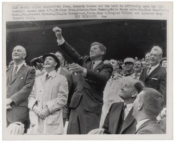President Kennedy tosses out the ball to officially open the baseball season at D.C. Stadium back in 1962. Also pictured are VP Lyndon Johnson, Sen. Mike Mansfield, Interior Sec. Stewart Udall, and Sen. Everett Dirksen. NRMT. 8x10".