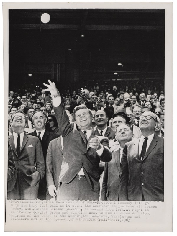 President Kennedy, alongside Washington Senators Chairman James Johnston, lets go with his hard fastball as he opens the AL baseball season in 1963. NRMT. 8x10".