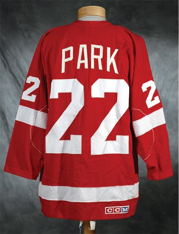 From Hall of Famer Brad Park's final season in the NHL. Red Wings jersey has "CCM" size "50" tag in faded ballpoint and "long" in faded ballpoint. "CCM" patch on reverse tail. No game use evident, but did receive some washings and is in spectacular condition.