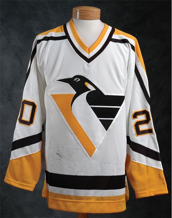 Cool Hand Luc is the all-time highest-scoring left winger in NHL history. This is Luc's game worn jersey from a short stint with the Pens during the mid-1990s. Plastered home CCM knit with faded "20" in black marker and a born-on sticker on back of CCM tag, with size "54" fly tag close by. Lots of stick marks and slashes, especially on the front.