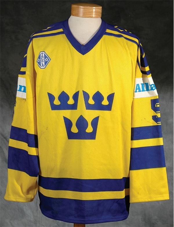 Bright yellow and blue Tackla sweater worn by Ulf while playing for Team Sweden. "XL" tag in collar. "Allianz" patches on both sleeves. "Tackla" on right breast. Stick marks on front and sleeves. Red marks on left sleeve, nice game use.