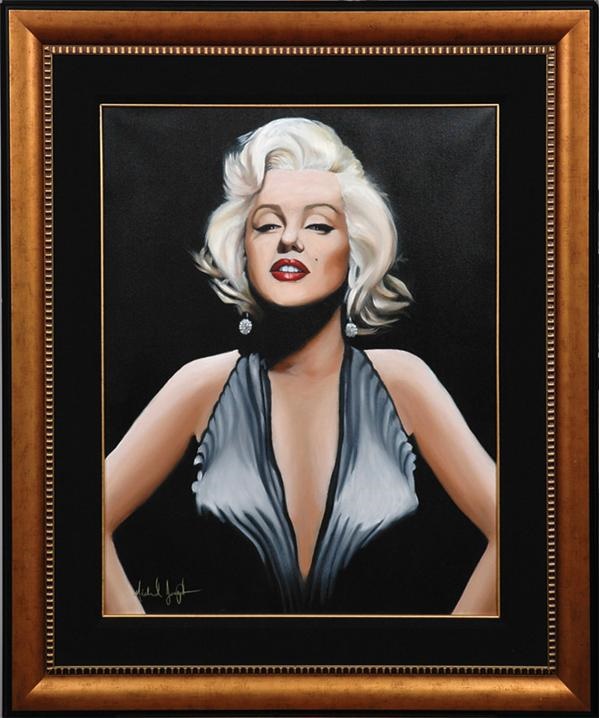 Artist Michael Joseph is a sports enthusiast, and his love of the game inspired him to wield brush to canvas, and this gorgeous, atmospheric, and classically realistic portrait of American icon Marilyn Monroe carries his signature “raw realism,” while dripping with that trademark seduction only Monroe could project. The original oil painting is titled “Timeless Beauty,” and measures 30x24" in an elegant dark brown frame. Three signatures (average 9/10) accompany this work of art: one at bottom left on portrait, another on back of its canvas, and a third on a “Society” Magazine Cover (included).