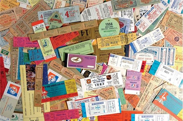 A colorful and plentiful array of sports, political, cultural event and entertainment tickets, 275 of them! Unused and ranging in years 1920 to 1980, including World’s Fair 1939 - 1964, many classic baseball fields including Ebbets, Yankee Stadium and the Polo Grounds, Army and Navy games, Sinatra at Madison Square Garden, Stanley Cup, World Series, college football, Rolling Stones at MSG, Wrestlemania, movie premieres, Lyndon Johnson Salute at MSG, and the 1942 Democratic Convention, just to name a few. Here it is, a good part of the 20th Century and all its cultural glory, all in tremendous shape.