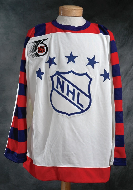 His second year in the NHL and with the Pittsburgh Penguins, Jaromir Jagr donned this game-worn sweater in the 1992 All-Star Game, the same year of play he helped his Pens win their second consecutive Stanley Cup title. This jersey shows light but evident use. On the reverse is nameplate with Jagr’s name sewn in, and “68” below that. Front carries a simple design of the blue and white NHL logo crowned with five blue stars, and the NHL 75th Anniversary patch on the right chest. Maska tag hangs in collar, along with size “52” tag.