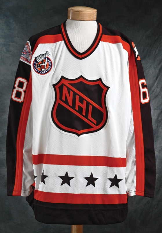 A true All-Star, right winger Jaromir Jagr’s early years as a Pittsburgh Penguin were blessed, and after assisting two consecutive successful Stanley Cup runs, he skated with this 1993 NHL All-Star Game jersey in the Montreal Forum. Only improving on the two promising previous years, he tallied 34 goals and 60 assists in 1992-1993. Showing definite use, this orange, black and white jersey carries a centennial patch “Stanley Cup 1893-1993” on its right chest and a triangular patch “44th Match D’Etoiles, 44th NHL All Star Game, Forum de Montreal 1993” on its right shoulder. Displays simple black “Jagr” on the reverese’s white nameplate with tackle twill letters sewn individually above the “68.” NHL All-Star star shield sewn to left shoulder, “CCM” and “NHL” logos embroidered onto back right hem. Maska tag and size “54” tag hang from collar.