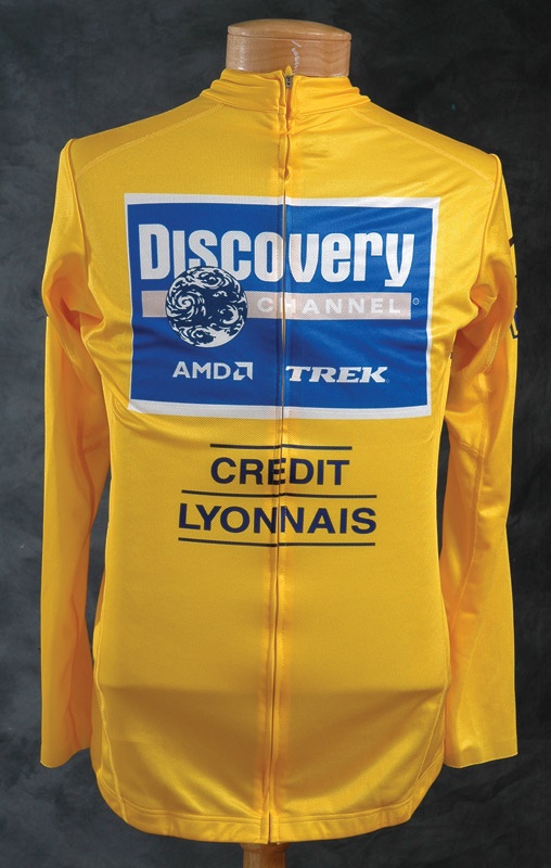 2005 was a year of particular significance. It was the record setting performance year and the final year of competition in the career of the retiring 7 time Tour de France champion. This yellow leaders jacket is more than just a jacket, it is a symbol that represents 7 consecutive Tour de France victories. A Tour de France milestone that will probably never again be achieved. Lance's 2005 "Team Discovery Channel" Tour de France yellow Leaders Race Jacket, was issued only by the tours organizers: the ASO, to the general classification leaders. Manufactured by Nike, the gold back-zipper garment is made complete with Armstrong's oversized black sharpie signature (9/10). LOA.