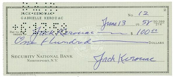 Kerouac was the leading chronicler of the beat generation, a term that he coined to label a social and literary movement in the 1950's. After studying briefly at Columbia University, he achieved fame with his spontaneous and unconventional prose, making it big with "On the Road". This check for 100 dollars is signed by Kerouac on both sides and also has him writing out his own name, as the check is made out to him. All (3) signatures grade 10/10.