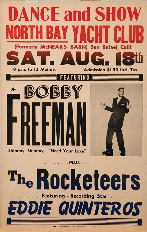 The year was 1962, and Bobby Freeman was singing and dancing his magic everywhere. In 1958, he wrote a song called Do You Want To Dance that has since been covered by hundreds of artists that run the gamut from The Beach Boys to The Ramones. He also went on to write and perform Shimmy Shimmy and Need Your Love. Poster (14 x 22") is of a concert he gave in San Rafael, California, at the North Bay Yacht Club.