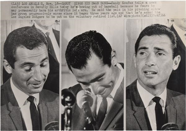 Prompted by fears that he may permanently harm his arthritic left arm, Koufax informs the media of his decision to retire. Front caption. Original press clipping. NRMT. 7x9”.