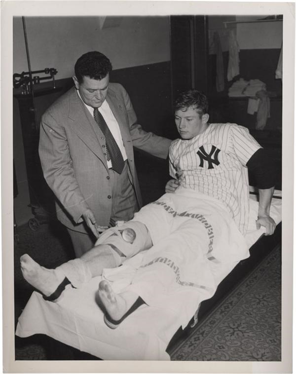 Mantle is seen in the locker room shortly after he sustained the knee injury that would haunt him throughout his career. He and Dimaggio were both in pursuit of a fly ball during the 1951 World Series when Mantle, at the request of Joe, pulled off. As he slowed his chase his foot became caught in a drain and the rest is history. Associated Press Newsphoto stamp. Original paper caption. NRMT. 7x9”.