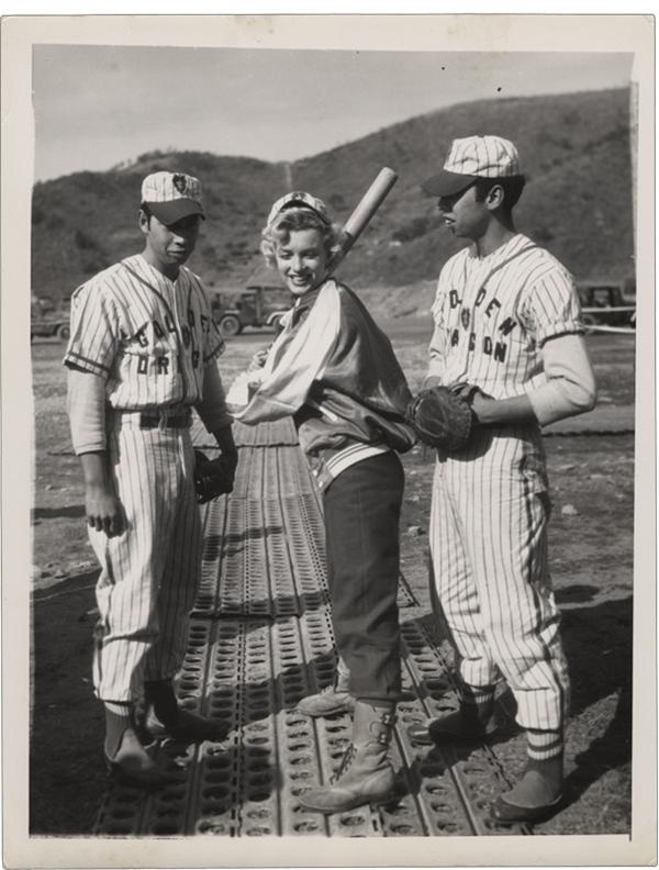 An image we have not seen before. Asian American team "The Golden Dragons" has their two luckiest players posing sexily with Marilyn. She is at the USO event that she postponed her honeymoon with Joe DiMaggio for. This was the beginning of the end. Marilyn Monroe pieces with baseball content is rare and oh so desirable. International News wire photo is 7x9" and strong EX+.