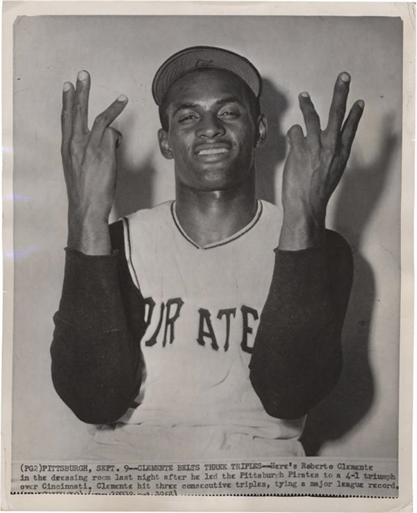 Here’s Roberto Clemente celebrating his big night of September 9, 1958. That evening he hit three consecutive triples against Cincinnati to tie the MLB record. Front caption. Original press clipping. NRMT. 8x10”.