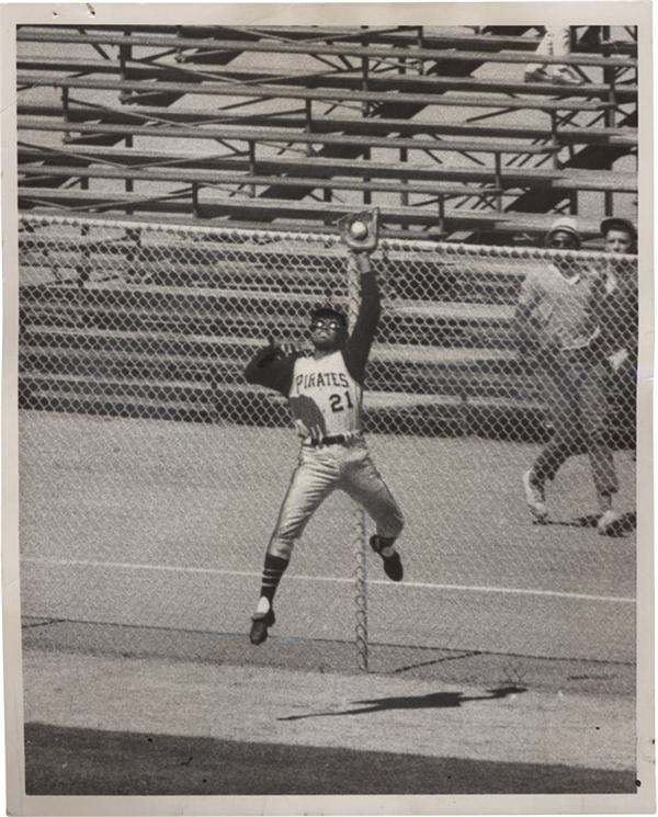 An incredible action shot of the acrobatic Clemente mid-flight, moments after snaring Willie Mays’ homerun-bound ball from the sky. Original press clipping. EX-MT+. 8x10”.