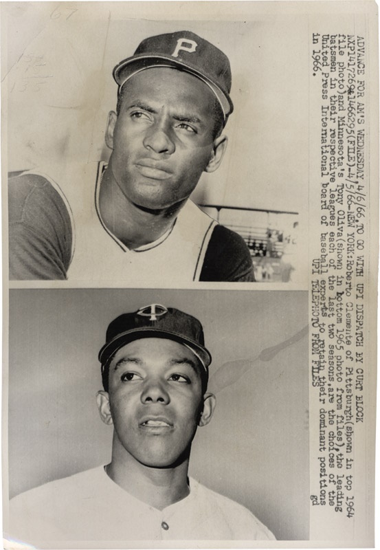The leading batsman in their respective leagues, Roberto Clemente and Minnesota’s Tony Oliva, appear in this dual photo released prior to the start of the ’66 season. Front caption. Mint. 6.75x10”.