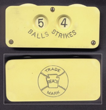 Remarkable celluloid ball-strike counter from the short period when there was a five balls and four strikes rule. Reach keystone logo on the verso, 1886 patent dated. EX-MT.