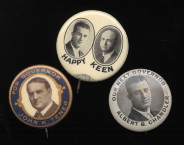 Three interesting baseball-related pins that are also politicos: For Governor John K. Tener, Our Next Governor Albert B. Chandler, and jugate of "Happy" Chandler and Keen. All about 1". NRMT.
