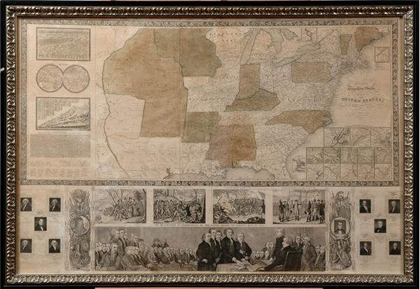 This is a scarce wall map version of Phelps & Ensign's important traveler's guide. It portrays the United States as far west as the Black Hills of the Missouri Territory depicting stage, steamboat, canal and railroad routes. Thirteen small inset maps detail the vicinity of major cities, with two other insets of upper Maine and the Florida Peninsula. At left are a small double hemisphere world map and comparison charts of the mountains and rivers of the world. Other features of the map include several historical vignettes including the landing of the pilgrims, the battle at Lexington, the battle at Bunker Hill, Washington's farewell to his army and the signing of the Declaration of Independence, the text of the Declaration of Independence, and portraits of ten presidents. It is incredibly well preserved and conservatively graded as EX+, with no signs of restoration. Framed to 29.5x41".