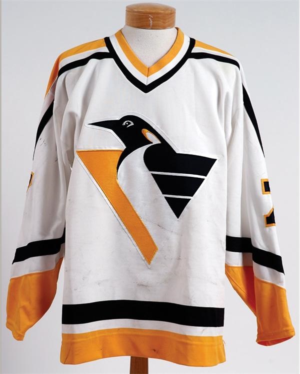 The first American-born NHL player to score 500 career goals and the first to record 1,000 career points, Joe defined the term "underdog." Undersized and undrafted he went on to become one of the all-time greats and etched his place in hockey history forever. This home (white) jersey displays outstanding use, with plenty of stick and colored board marks. Great burns and small holes on the lower portions of the sleeves are matched by a nice amount of pilling built up within. Tagged on the collar with "CCM-Maska" and [size] "50" fly tags. A must for any serious hockey collector.