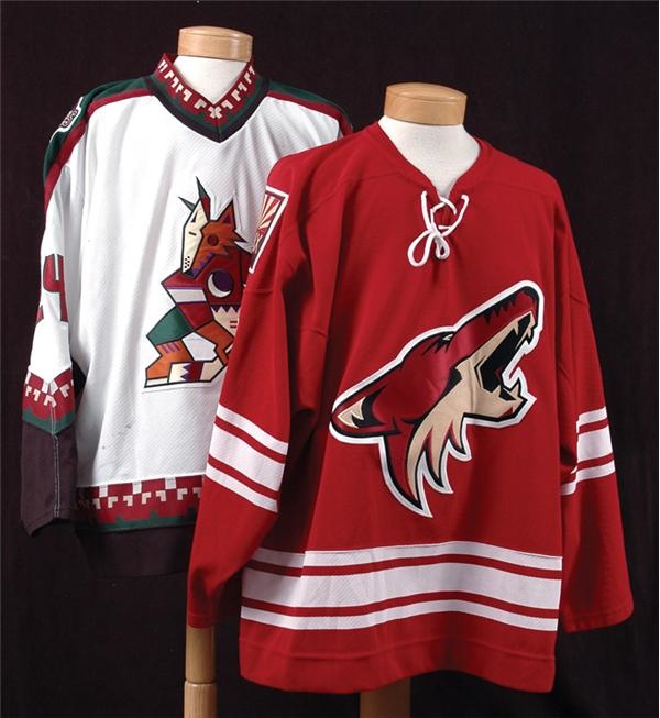 Two jerseys from the two partial seasons Jan Hrdina spent with the Phoenix Coyotes. First jersey has a patch sewn into the inside tail that reads, "Official 2002/03-2 Game Worn Jersey." Manufacturer “Made in Canada" and size "54" fly tags in collar. Reverse tail has embroidered NHL logo. CCM patch on upper back of neck. Second jersey has a patch sewn into the inside tail that reads, "Glendale Arena Opening Night 12-27-03 Official Game Worn Jersey." KOHO patch on back of neck. Embroidered NHL logo on reverse tail. Manufacturer "Made in Canada" and size "54" fly tags in collar. Both show use and come with Letter of Authenticity from the Phoenix Coyotes.