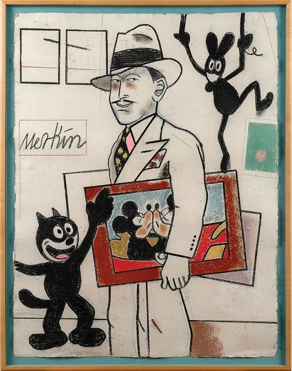 One of Merkin's best in crayon on artist's paper. It shows a young Walt Disney in his salad days in Kansas City going from agency to agency lugging his dreams in the form of a snuggling Mickey and Minnie under his arm. Marvelous fantasy piece shows Felix the Cat touting his greatness while Harriman's Ignatz Mouse marks the derivation of that character to early Mickey. Superb color, artist signed and supremely impressive. Work itself is 38x29", beautifully museum framing by Merkin himself. Richard Merkin is an important American artist whose work can be seen in Vanity Fair, The New Yorker and other important publications.