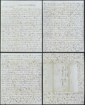 Predating the advent of organized collegiate football by two decades, this letter holds the distinction of being the earliest reference we have seen in print to the sport. Elegantly scripted correspondence dated, "New Haven, Ct. Nov. 17th, 1849," discusses personal matters at some length before coming to the historic text, "...the students here are every day more or less engaged in the football game, though I have as yet taken no part in it. It is rather violent and dangerous several fellows here have been maimed for life by being to zealous in the game..." One of the most impressive football pieces we have had the honor of auctioning, in splendid NRMT condition.