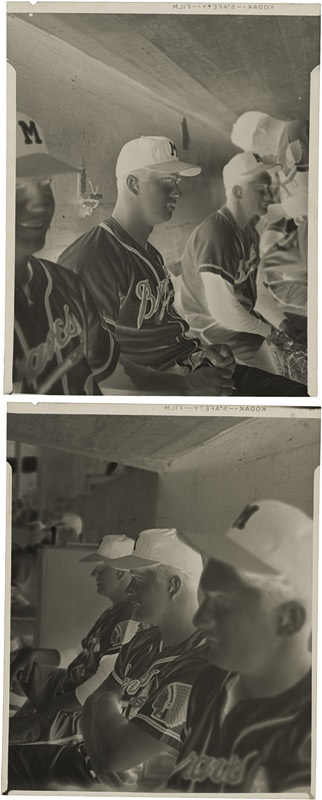 In the dugout, at the batting cage and again in the dugout. Three terrific shots in black and white. From the Mid 1950's and dressed in Milwaukee Braves uniform. NRMT.