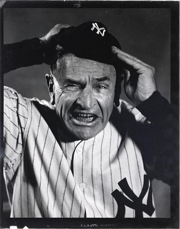 1950's black and white shot of Stengel in Yankkes garb with twisted facial expression as only Casey could do. EX-MT.