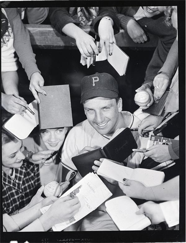Charming black and white shot of Kiner at Forbes Field in the 1950's being flocked by fans who are seeking his autograph. EX-MT.