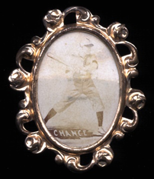 The final stop of the famous Chicago Cubs double-play combination. Ornate pin dates from near the end of this Hall of Famer's reign as a player. Real photo. EX. 1x1.5".