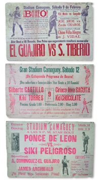 Three extremely rare posters from the Gran Stadium in Camaguey, Cuba: 1) 1929 Kid Chocolate. Kid Chocolate is pictured prominently at bottom. The earliest Kid poster known, this is from one of his original fights before he ever made it to New York. Versus Ciriaco Jova Saguita, Kid is billed as "The Cuban Marvel." 14x22". 2) Fighters are pictured and include Kid Mario-Conguito, Joe Moe-Zurdo Charol, and Chino Villa Alegre-J. Vidal. The big fight is El Guajiro versus S. Tiberio. 12x18". 3) Siki Peligroso versus Ponce De Leon. This Cuban fighter of the 1920's was named for Battling Siki. He even looks like the Senegalese champion. "Peligroso" translates to "Dangerous." 14x22". All the posters have damage including holes and water stains. Overall they have a nice look and are so rare what else can you do?