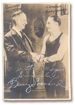 Benny is posed with the Presidential candidate and New York political icon. Signed in white "To My Pal Senator Bill Lyons, Benny Leonard." 4.5x6.5". Sig and photo are EX+. From the Bill Lyons Collection.
