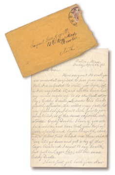 One of the few pieces we have seen that combine the Civil War and the National Game (the whole point of the War). Union Soldier's letter measuring 5x8", four full pages in pencil on one foldover sheet, dated April 24 1863 (Boston). By George G. Learned (1st Massachusetts Infantry) to Sgt. George O. Jewett (17th Massachusetts Infantry). Fantastic content: "Work is awful dull in Boston and now is a good time for getting recruits. Baseball and cricket are played out." Also, refers to the New Orleans 4th Regiment as the "Nigger Brigade." EX. The first Civil War baseball letter we have seen.