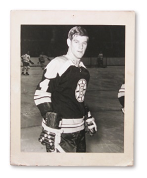 Wonderful mounted photograph of Orr at his peak with the Boston Bruins in the late 1960's. From one of the top Boston area photographers the contrast is amazing. Some wear to the mount, photo is perfect.