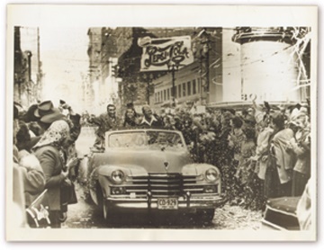Cherished image of the Indians finally making it with Bill Veeck and Lou Boudreau in lead car. Great Pepsi Cola sign overhead as this is the pause that refreshes. International News photo stamp, caption on verso. NRMT.