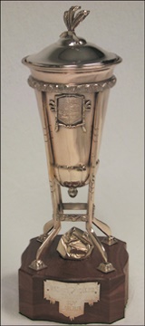 Perhaps the most beautiful and certainly the most intricate of the NHL team awards, the Prince of Wales Trophy was presented to the regular season Champions of the conference bearing its name. This personal miniature was presented by the National Hockey League to Guy Lafleur as a member of the 1972-73 Montreal Canadiens. Four towering sticks rise from the wood base to support a silver plate cup with attached lid. A plaque on one side of the base reads "HRH Prince of Wales Trophy - Guy Lafleur." The opposing side is inscribed "NHL Champions - 1972-73 - Club de Hockey Canadien." In excellent condition. LOA signed by Guy Lafleur.
