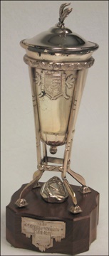 A stellar 127 point regular season clinched the Wales Trophy for the Montreal Canadiens in 1976. They would continue on to capture the Stanley Cup this year. This personal miniature was presented to Guy Lafleur as a member of this Championship team. Four towering sticks rise from the wood base to support a silver plate cup with attached lid. A plaque on one side of the base reads "HRH Prince of Wales Trophy - Guy Lafleur." The opposing side is inscribed "NHL Champions - Montreal Canadiens - 1975-76." Slight damage to the lid can easily be replaced or repaired. A fresh application of silver could restore the sparkle to this treasure. LOA signed by Guy Lafleur.