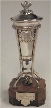 Coming within one win of matching their record of the previous season, the Montreal Canadiens once again rose to the top of their conference and were named the Prince of Wales Champions. The NHL presented this personal miniature to Guy Lafleur as a memento of the 1977-78 season. Four towering sticks rise from the wood base to support a silver plate cup with attached lid. A plaque on one side of the base reads "HRH Prince of Wales Trophy - Guy Lafleur." The opposing side is inscribed "NHL Champions - Montreal Canadiens - 1977-78." Slight damage to the lid is the only real flaw in terms of condition and can easily be replaced or repaired. Included is a LOA signed by Guy Lafleur.